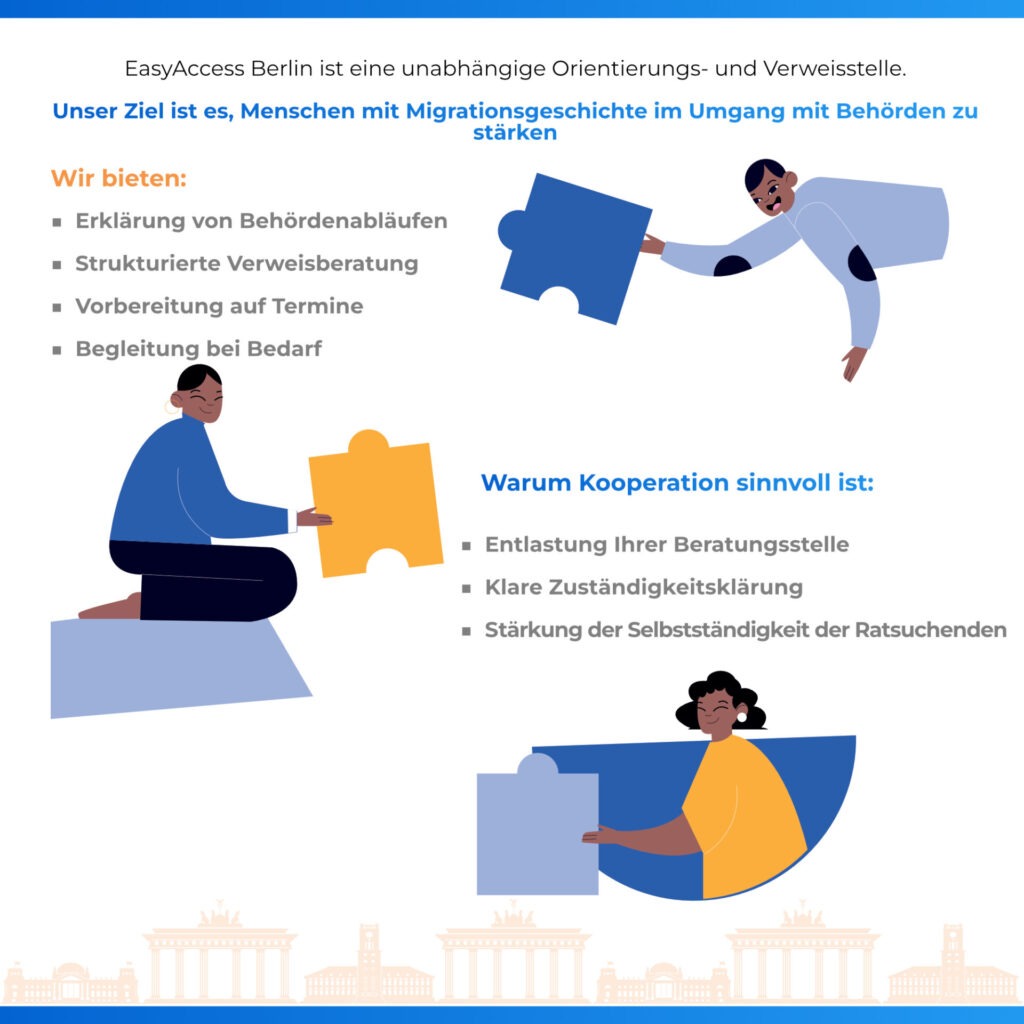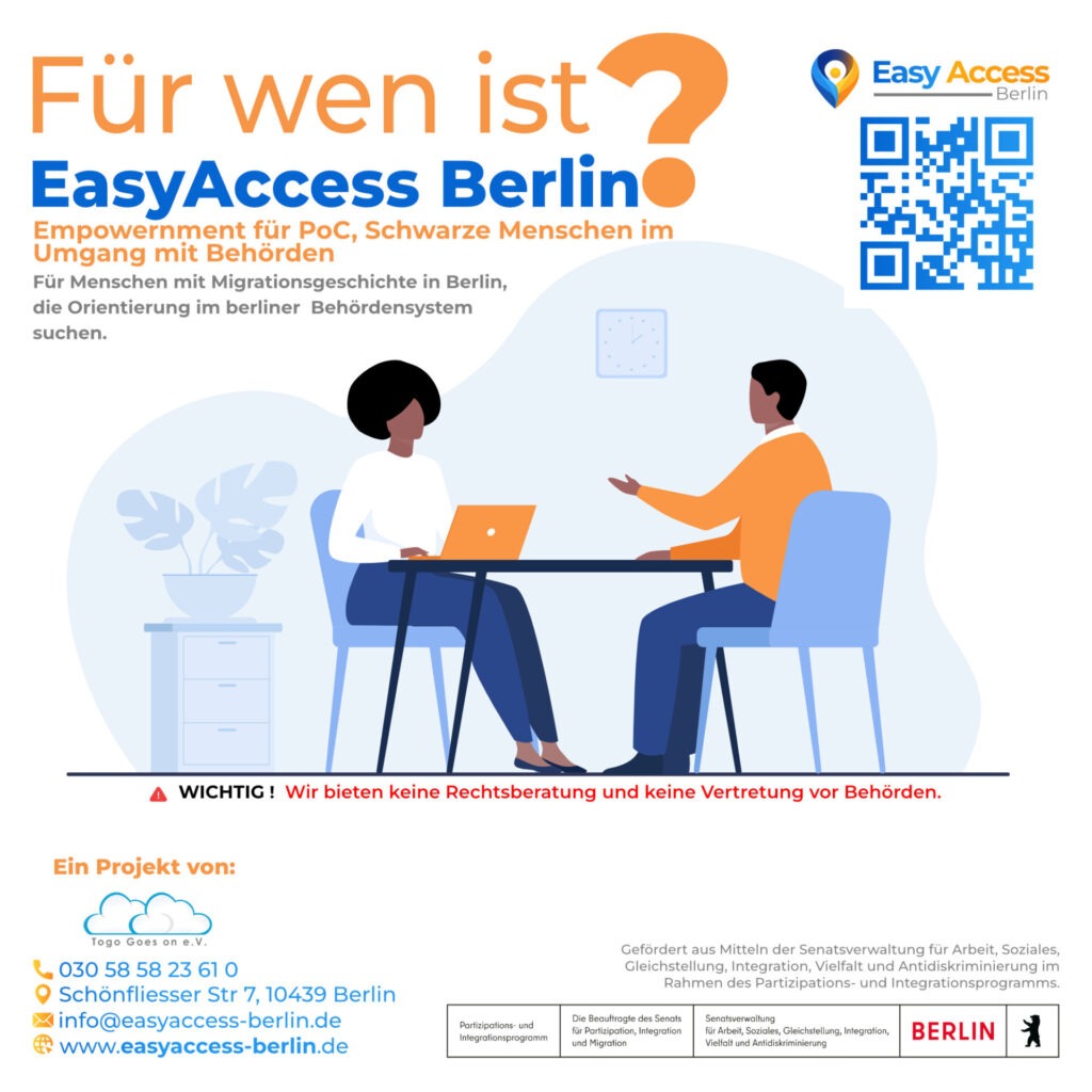 EasyAccess Berlin unterstützt Schwarze Menschen und People of Color im Umgang mit Berliner Behörden durch Verweisberatung, Workshops und Austausch in der Community. Das Projekt stärkt sie darin, ihre Rechte besser zu verstehen und selbstständig zu handeln. Gleichzeitig fördert es Vernetzung und aktive Teilhabe am gesellschaftlichen Leben.