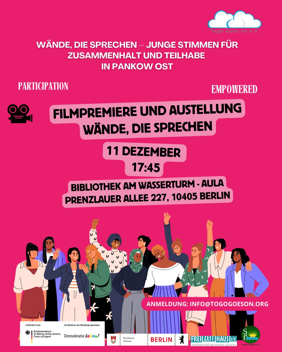Erlebt gemeinsam mit uns , In kooperation mit Sources D’espoir e.V. und Freizeit Haus e.V. in Pankow Heinersdorf-Weissensee, die Premiere des Projektfilms sowie die interaktive Ausstellung, die die Stimmen, Träume und Perspektiven junger Frauen mit Flucht- und Migrationserfahrung sichtbar macht.