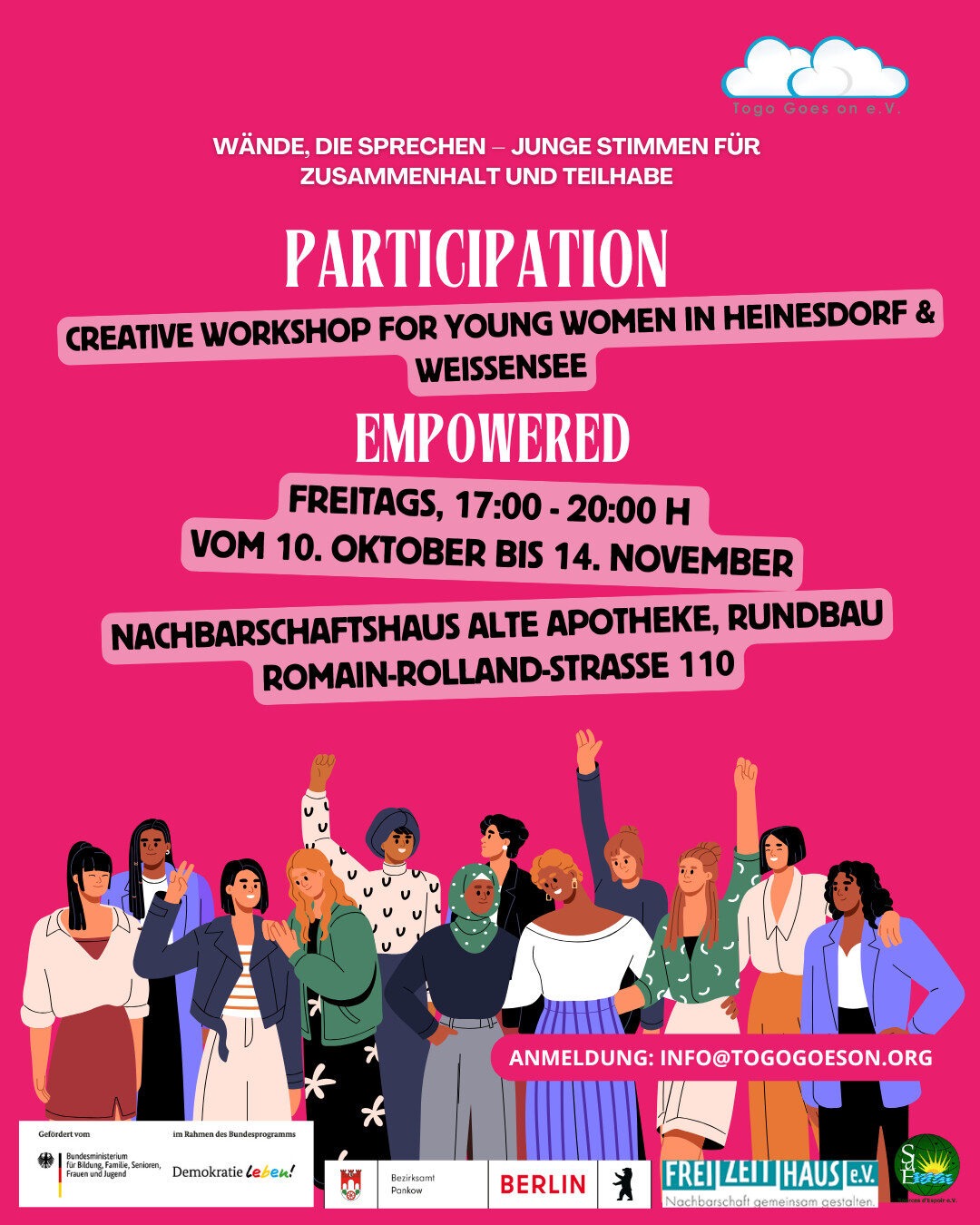 Geflüchtete Mädchen und junge Frauen bis 27 Jahre aus Pankow Heinesdorf, Weissensee gestalten gemeinsam ein „Textiles Parlament“ – ein kreatives Beteiligungsprojekt, das persönliche Botschaften, Wünsche und Perspektiven sichtbar macht. In begleiteten Werkstätten setzen sich die Teilnehmerinnen mit Themen wie Zusammenhalt, Demokratie, Respekt und Zugehörigkeit auseinander. Dabei entstehen Stoffbanner, Textilkunstwerke und visuelle Statements, die auf einem Kulturfestival öffentlich präsentiert und am Ende in Form einer Ausstellung gezeigt werden.